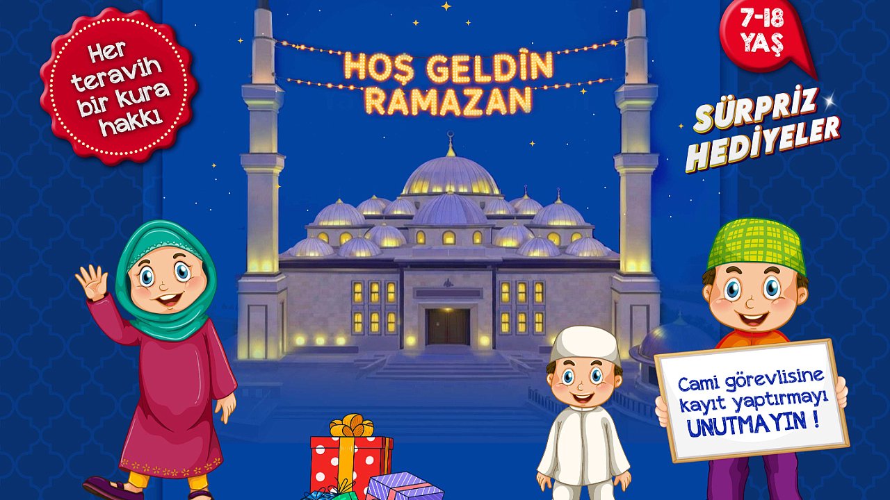 7-18 yaş arası çocuklara yönelik hazırlanan programda, her teravih namazına katılan çocuklar için bir kura hakkı verilecek. Ramazan boyunca sürecek etkinlikte sürpriz hediyeler çocukları bekliyor. Hediye kurası ise 18 Mart 2026 Çarşamba günü, son teravih namazında yapılacak.