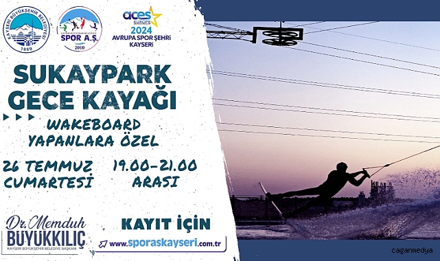 Bu çerçevede, Spor A.Ş. tarafından kayseri Büyükşehir Belediyesi’ne ait Anadolu Harikalar Diyarı içerisinde su sporları alanında hizmet veren Sukaypark’ta, 26 Temmuz Cumartesi günü 19.00-21.00 saatleri arasında, Gece Kayağı etkinliği düzenlenecek.